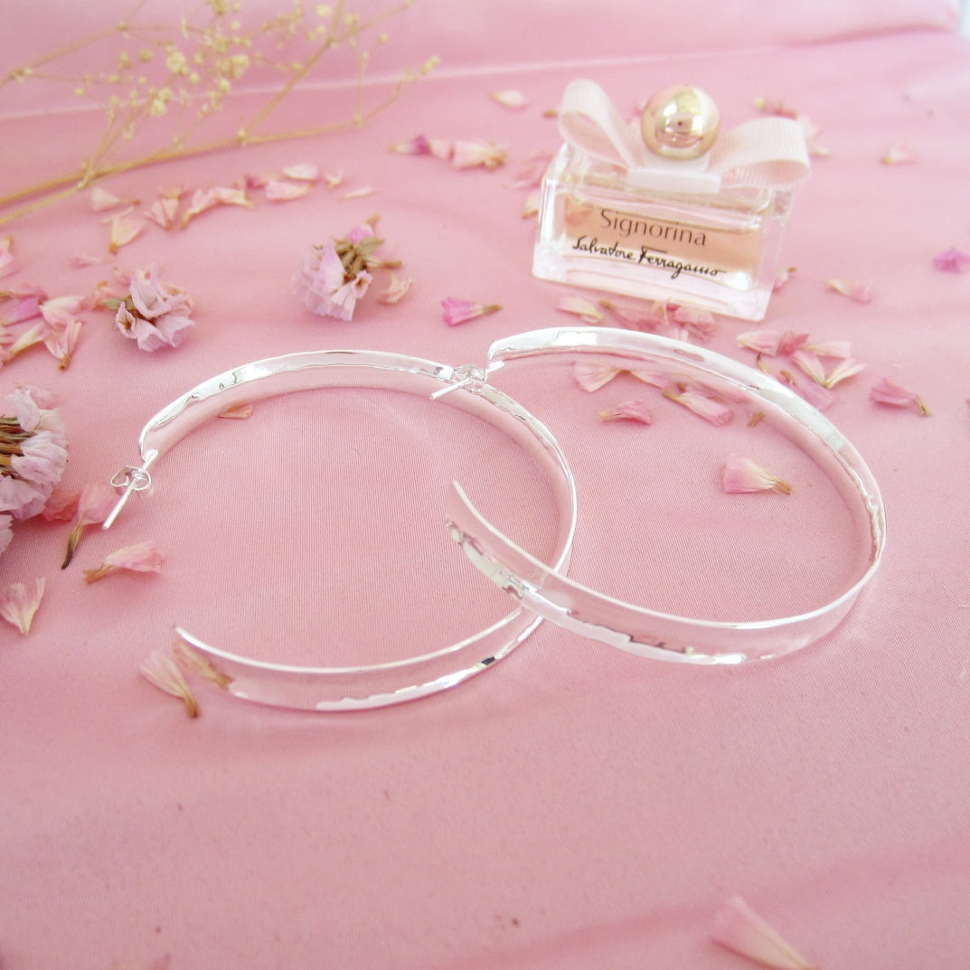 Arracada plateada maxi con acabado martillado que irradia elegancia bohemia. Su textura artesanal crea movimiento y profundidad visual. Una pieza audaz que celebra la belleza de lo hecho a mano con sofisticación contemporánea.
