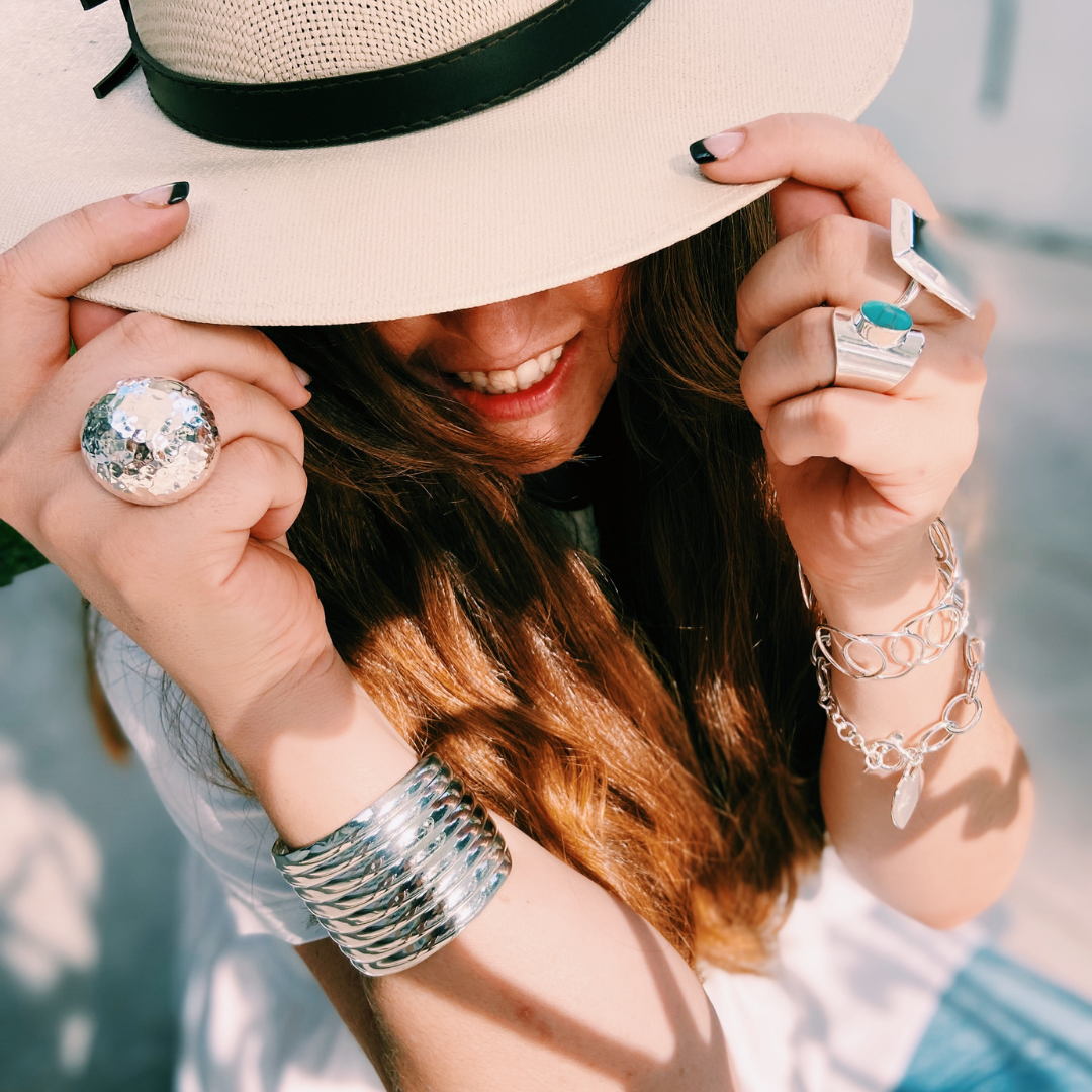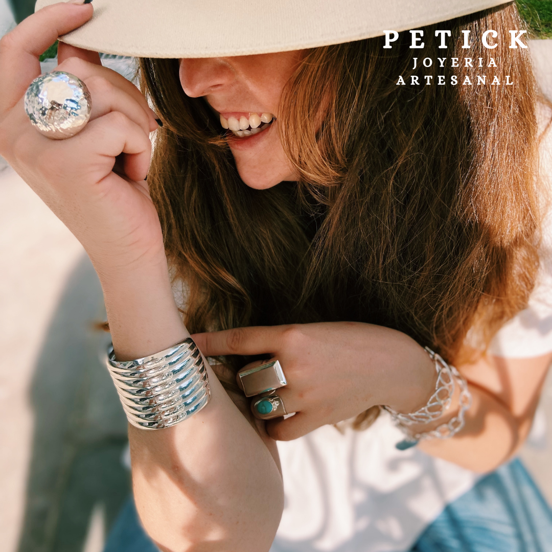 Anillo plateado con acabado martillado que captura la esencia del diseño maximalista contemporáneo. Su forma de chupón grande genera un impacto visual audaz y distintivo, perfecto para quienes buscan expresar su personalidad a través de accesorios únicos. El sistema ajustable garantiza comodidad en cualquier dedo, mientras que el plateado pulido realza su elegancia atemporal. Una pieza versátil que transforma cualquier look con sofisticación y carácter.