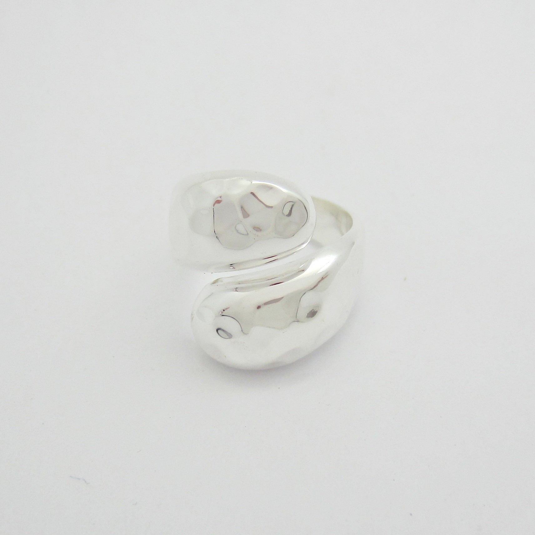 Un anillo vaciado con un diseño moderno y chunky, martillado a mano con un acabado plateado. Este anillo es una pieza exclusiva que agregaría un toque elegante y sofisticado a cualquier atuendo.