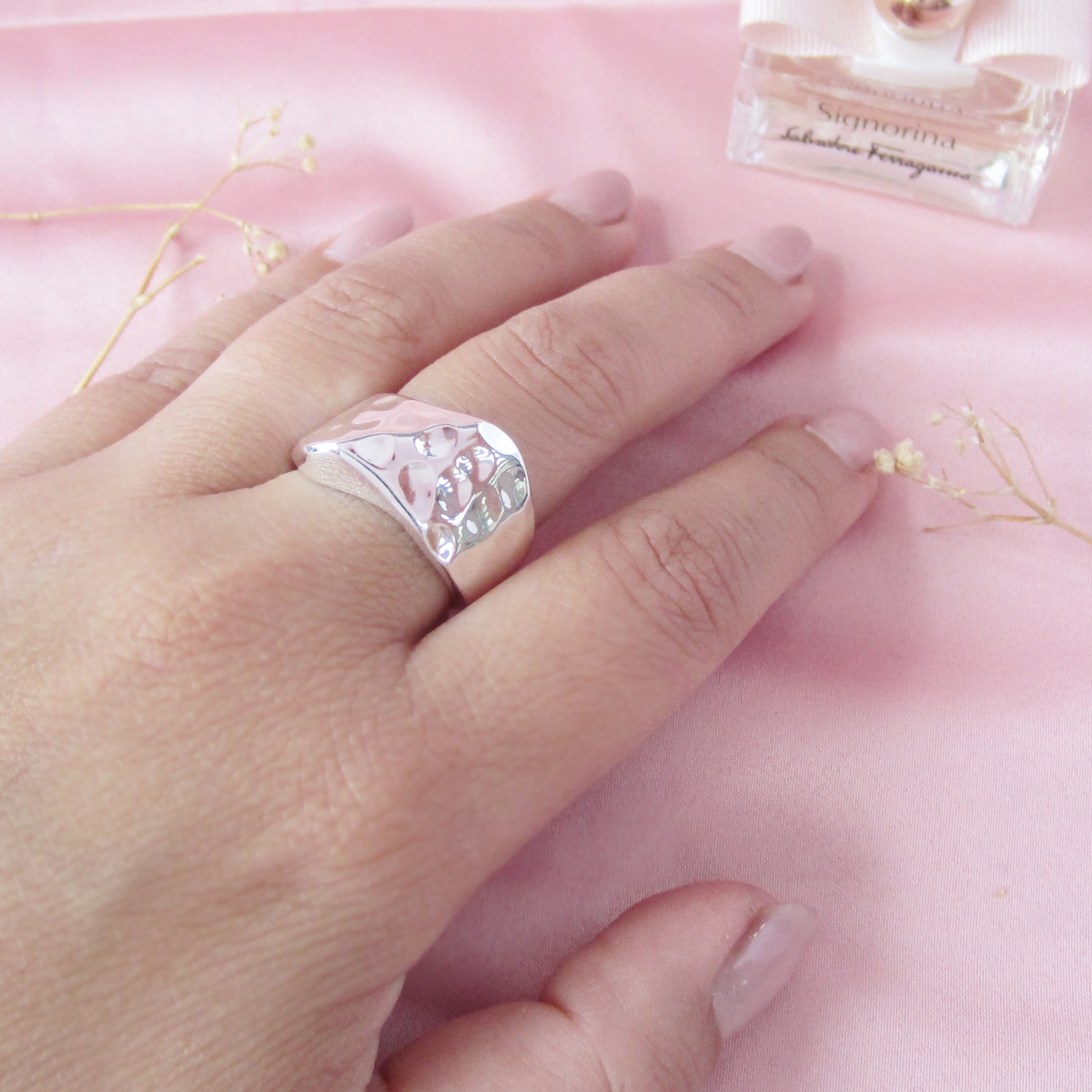 Eleva tu estilo con nuestro Anillo Plateado Vaciado Pellisco. Con un diseño martillado y chunky, este moderno anillo será la pieza clave para lucir elegante y sofisticada. Haz una declaración de moda con este accesorio exclusivo.