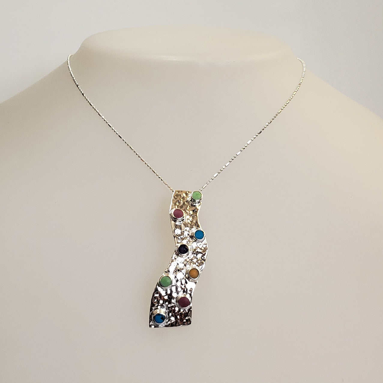 Dije plateado en forma de listón martillado con piedras de colores. Es un modelo rústico y bonito ideal para usarlo con gargantilla o cadena.